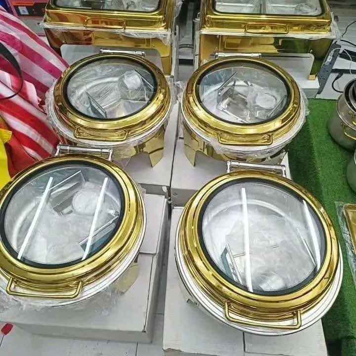 Each pallet includes multiple chaffing dishes, available in various sizes and styles, suitable for different events.